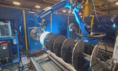宾夕法尼亚州霍尼布鲁克市费尔蒙特机械公司(Fairmont Machinery)的产品经理亚历克斯·伯纳姆(Alex Burnham)指着一台机器人,该机器人正在将一个连续的螺旋形状焊接到主轴箱/尾座单元上旋转的中心轴上。该单元没有使用示教器进行编程。相反,站在外围警戒的操作员可以通过屏幕查看数字孪生。单元内的摄像头捕捉到点焊组件的实际位置。软件将实际零件与模型进行比较,并根据需要进行调整。此时,焊接开始。