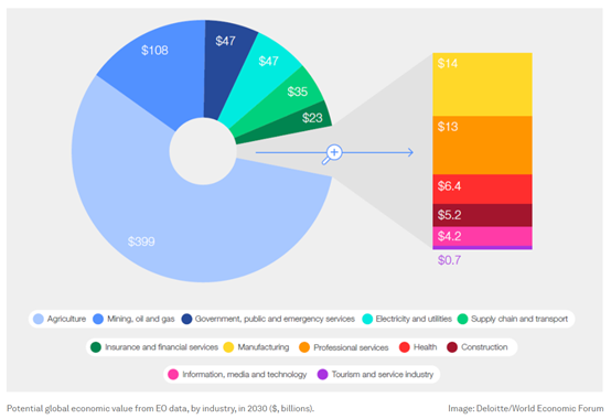有一千多颗卫星正在围绕地球飞行并不断收集地球观测数据。根据世界经济论坛与德勤合作发布的新报告,2023年至2030年,地球数据的累计潜在增加值可能达到3.8万亿美元。其中,六个重点行业占该产业总产值的94%。